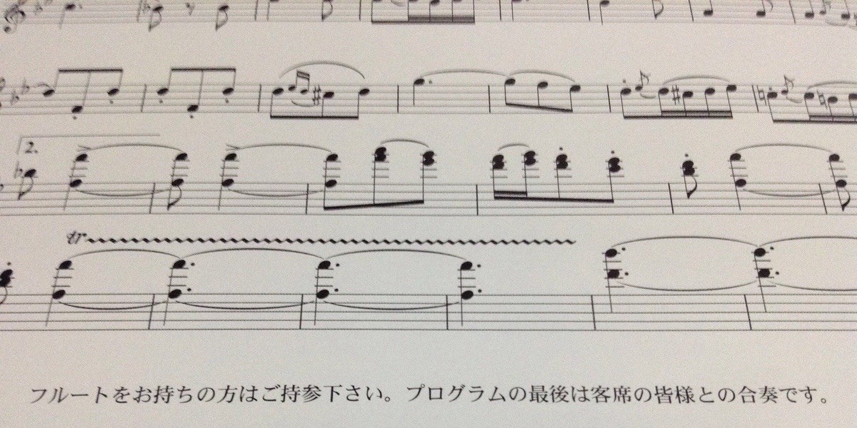↑『フルートをお持ちの方はご持参下さい。プログラムの最後は客席の皆様との合奏です。』