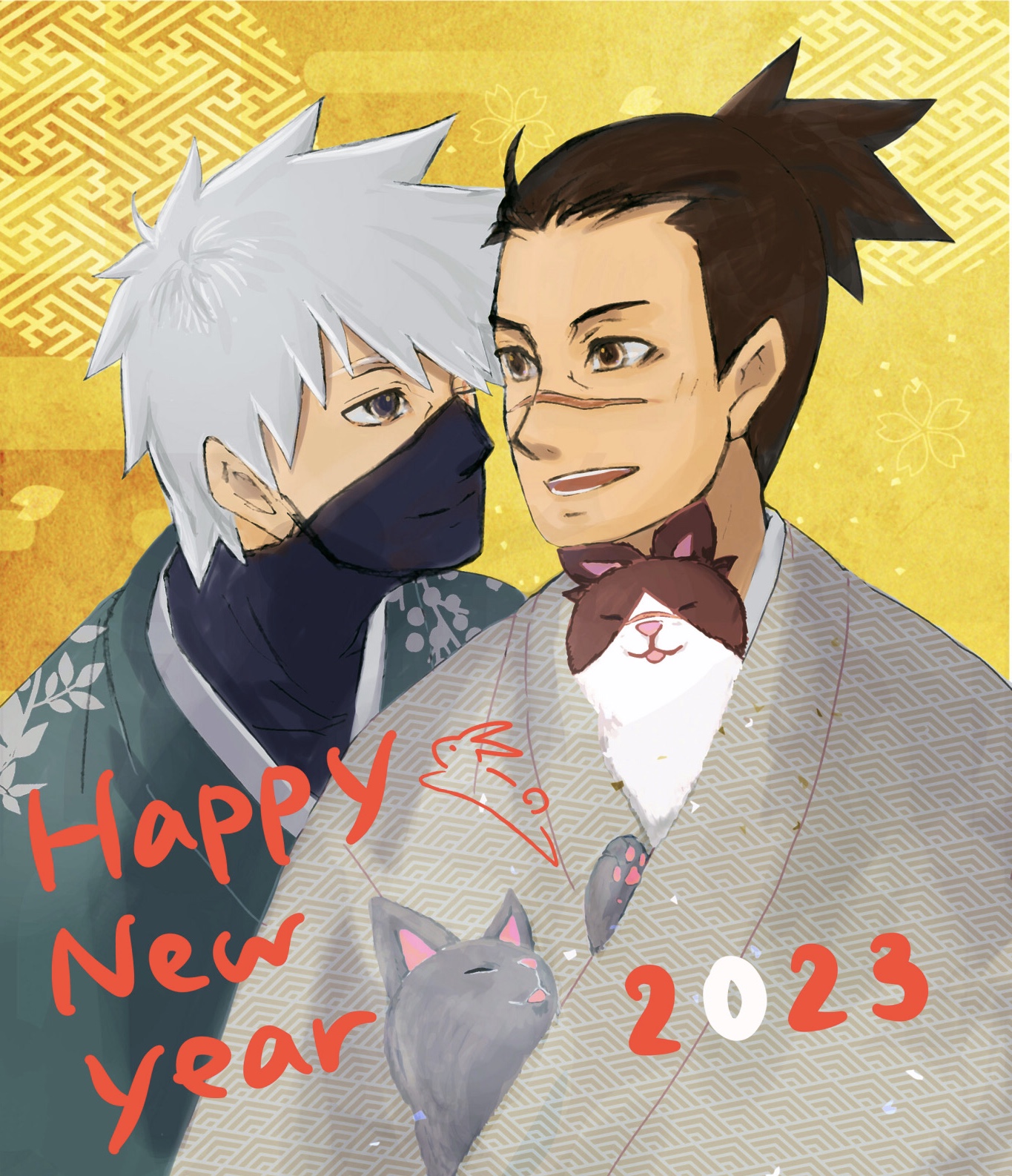 着物の柄はイルカ先生は菱青海波、カカシ先生は南天にしました。