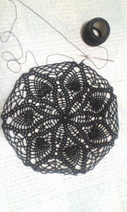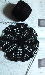 円形ジレになる予定なんですが・・・つまり、でっかいドイリーの変形なので、ドイリー部分は手元にある本を見て編んでます。