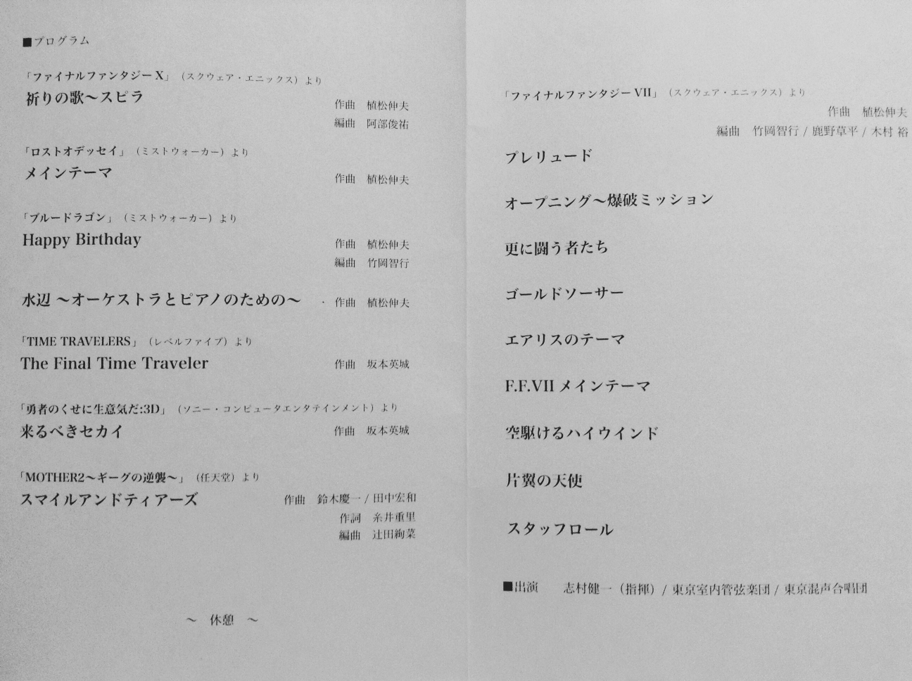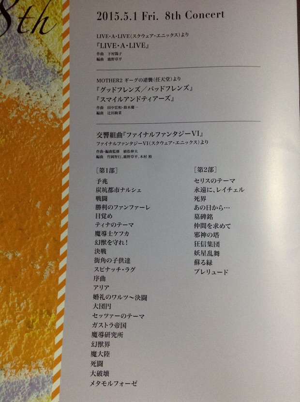 とても楽しかったです。あ、ライブアライブとマザー2の曲もやったんですが、マザー2のスマイルアンドティアーズで泣きそうになりました。本編(FF)前だったのに!でも演奏はちょっとアレだった。(笑)