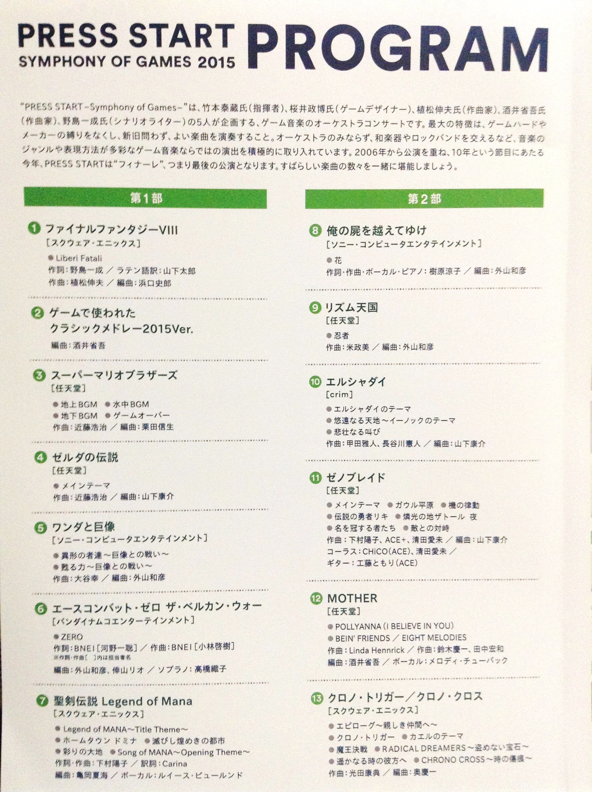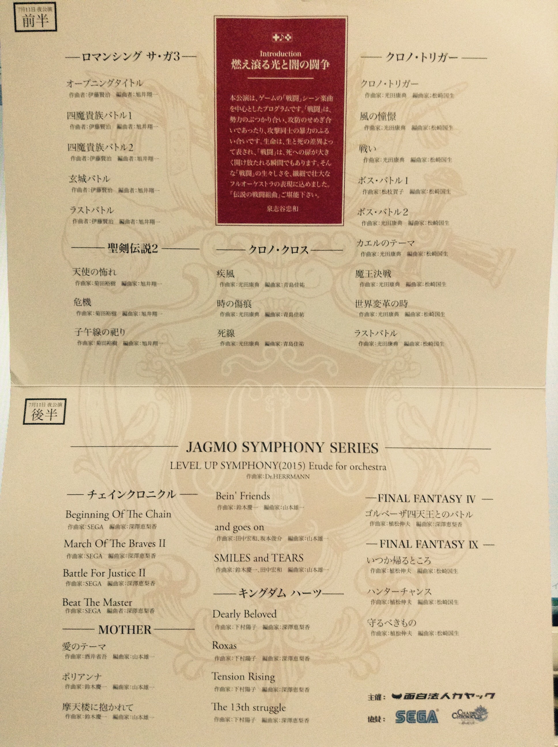 プログラムには載ってないんですが、レベルアップ交響曲というのもあって、ツイッターで募集してたレベルアップの音(イメージ)を実際に音にして、その音が鳴ると演奏もレベルアップしていくという趣向の演奏でした。ちなみに演奏曲はウィリアム・テル。まさかゲーム音楽聞きに来てウィリアムテルを聞くとは!最初はヘタっぽく演奏するんだけど、レベルアップ音が鳴ると上手になったりテンポ上がったり。剣の舞もちょっと混ざってた気がする。これ結構面白くて良かったです。