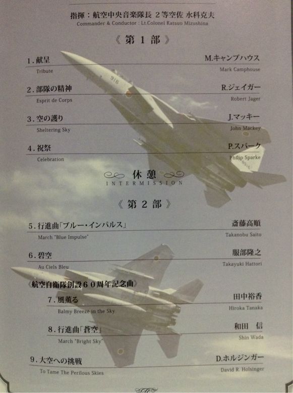 三曲目、空自公式行進曲『空の精鋭』。これは演奏しなれてるのか、格好良かったです。やっぱりアンコールは行進曲だよね~。みんなで手拍子が醍醐味だと思うの。結構好きな曲だった。