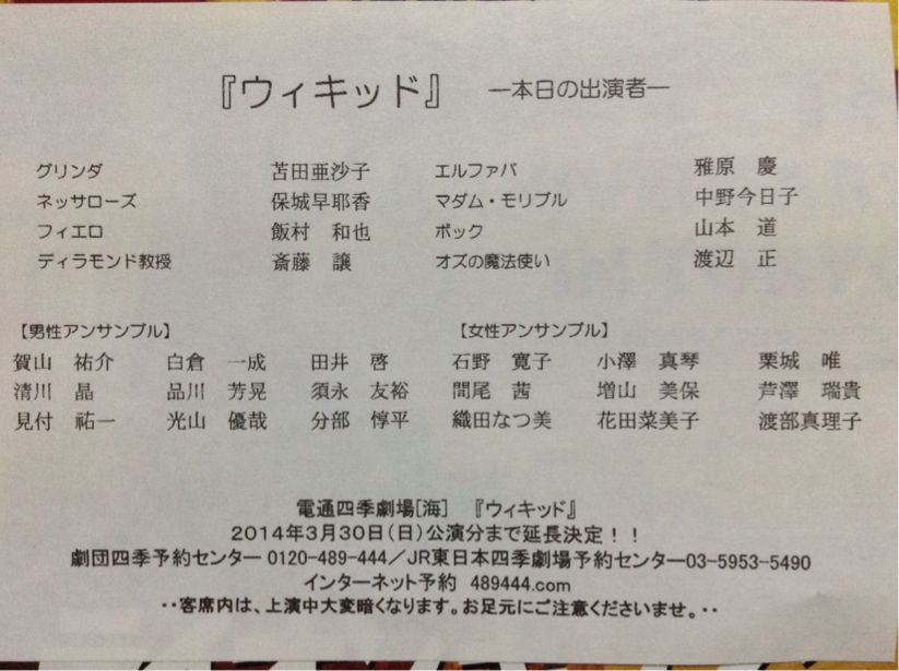 ウィキッドは女性が見ると面白いと思う。女の友情だし。最後に出て来た時、グリンダとエルファバがぎゅって抱き合うのがすごく良かった。