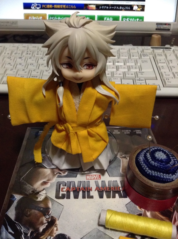 ただ、小さい人形で平安仕様にすると、袖が余る。とても。それは私が人形の肩幅を基準にして袖を作ってるからなんだけど。