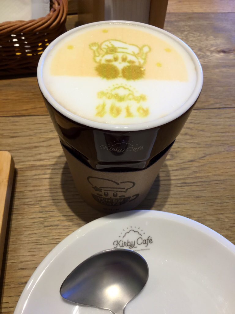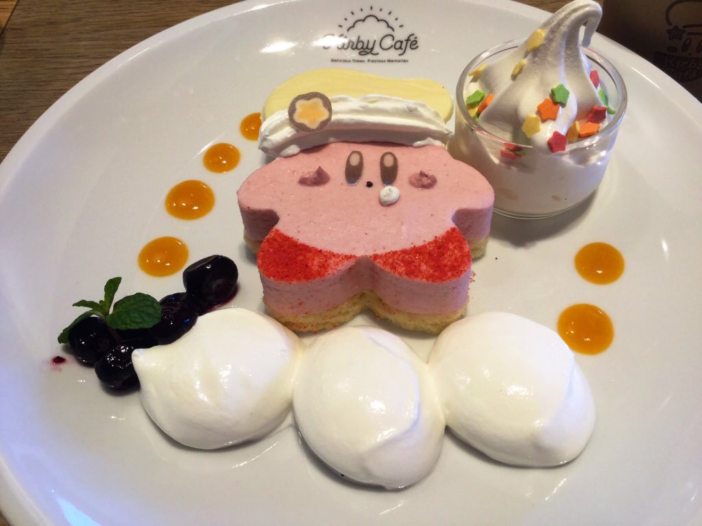 ストロベリームースのケーキ。上の飲み物と一緒に撮ろうと思ってたんですが、皿が大きくて画面に入らなかった。(笑)ケーキもちょっと大きめです。カービィはムースで、帽子(頭の上のクリーム色のやつ)はチョコレート(板)と、その下に果物&クリームが隠れています。足下はホイップクリーム。左の黒いのはブルーベリー。カップに入っているのはアイスです。結構なボリューム。この一品だけでも良かったなと思った。
