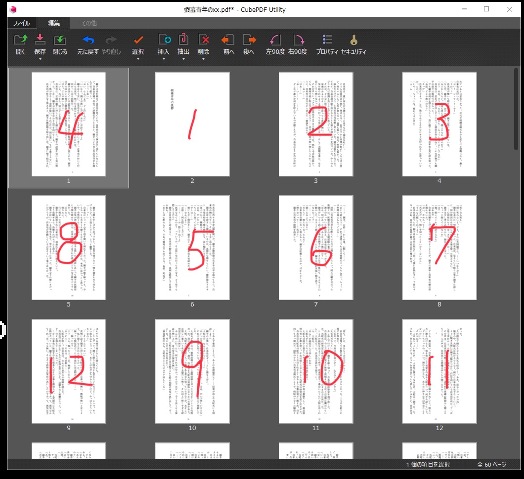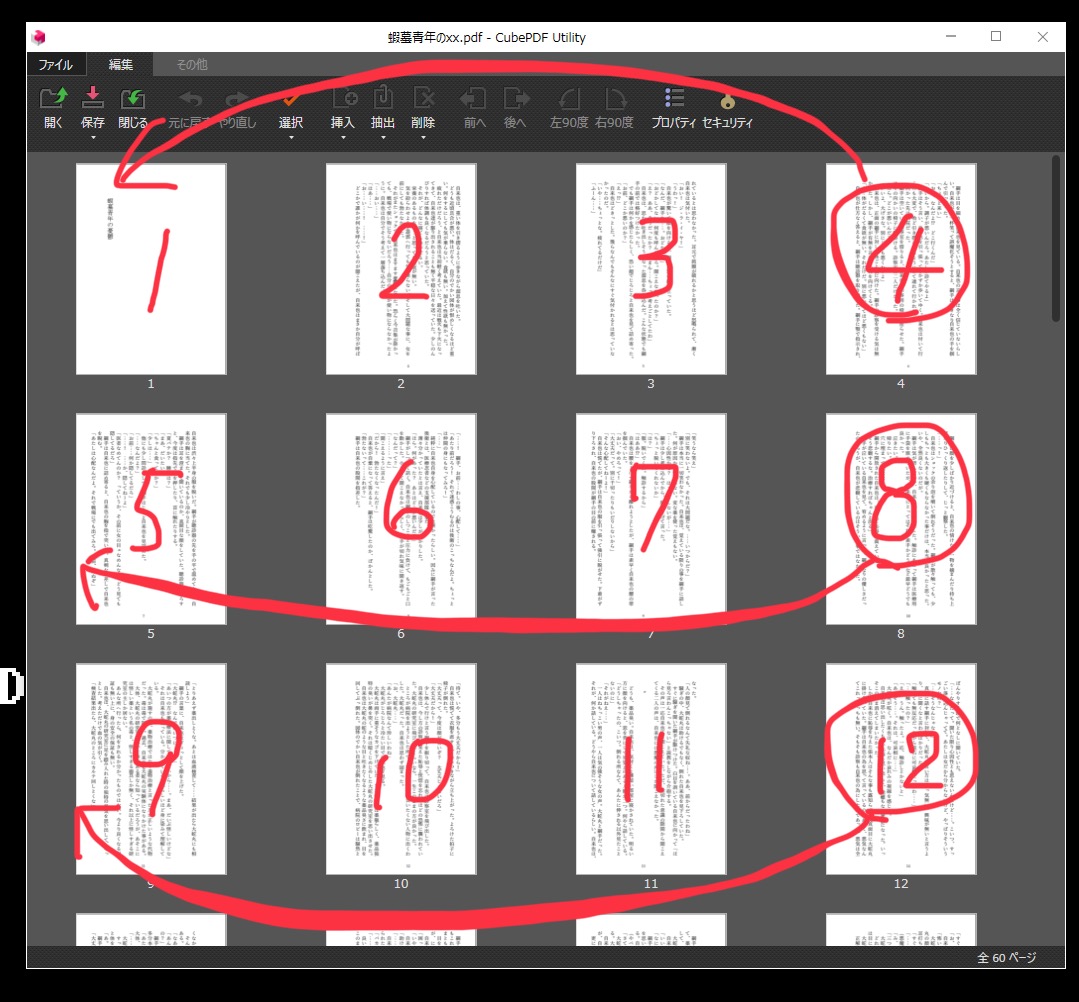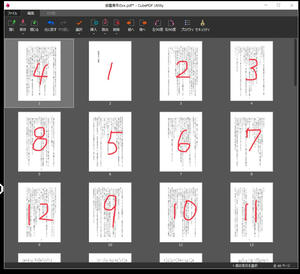 PDFの並び替えには、cubePDF Utilityを使っています。下の画像はそのスクショです。左上から右へ、1ページ目から順番に並んでいます。