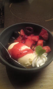 写真はデザートでしたが、アイスの脇に盛られているベリー系は全部凍ってました。冷えました。
